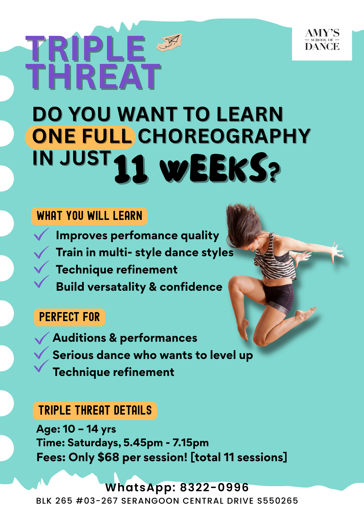 • Work towards one polished choreography in 11 sessions.