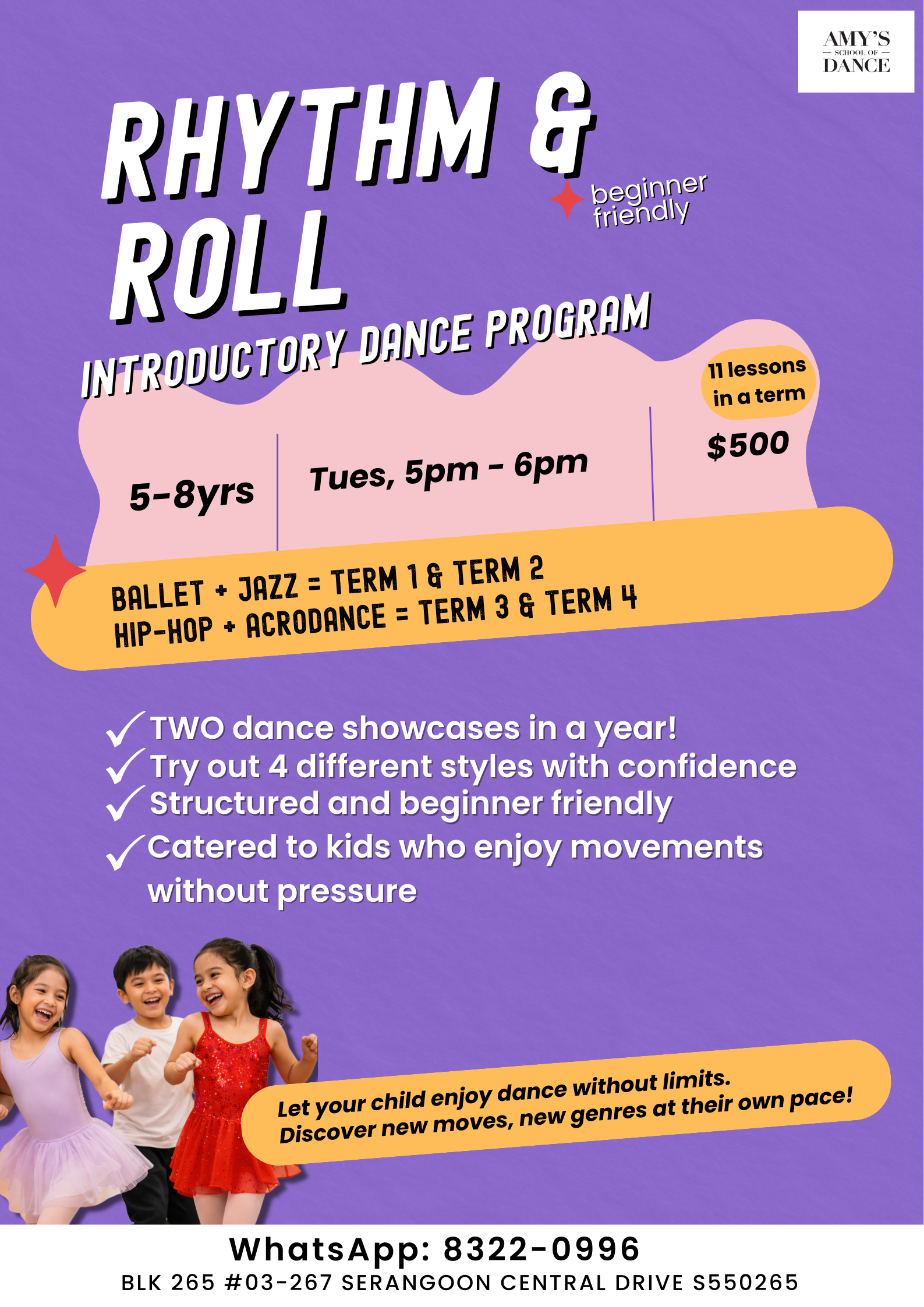 Experience a dynamic year-long dance journey that combines Ballet, Jazz, Hip- Hop, and Acro dance.
